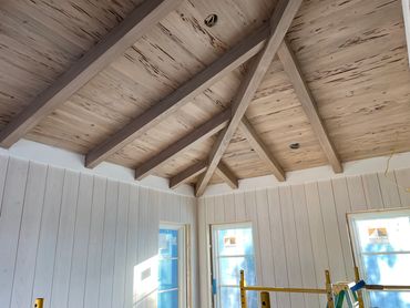 Interior of a room under construction with wooden ceiling beams and white paneled walls.