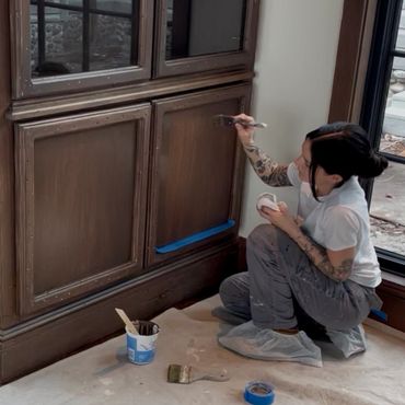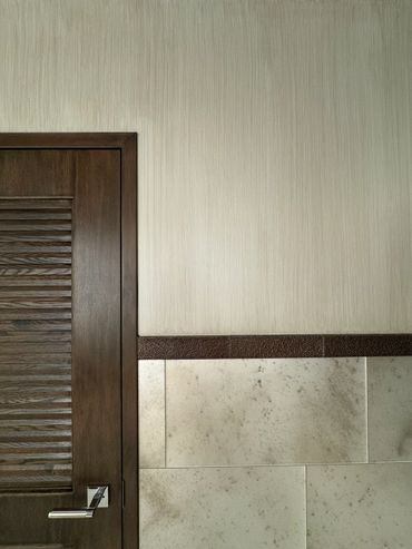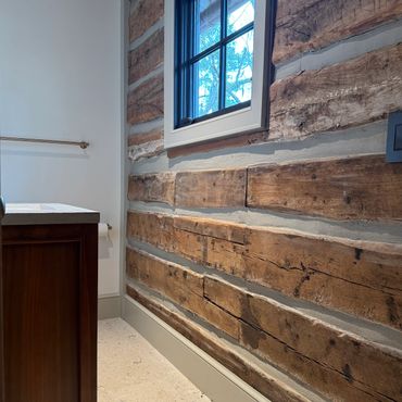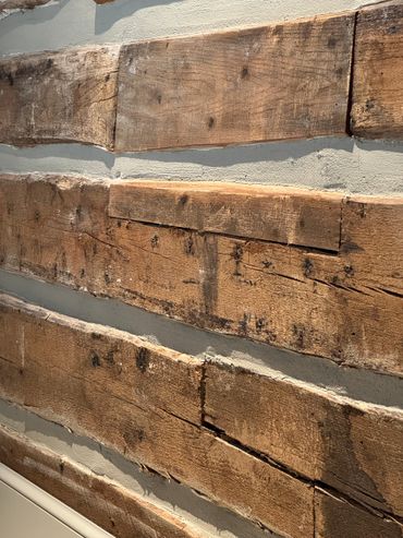 Partially whitewashed brick chimney with wood details and unfinished wall.
