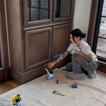 Unfinished brick fireplace with ladders and construction tools in a room under renovation.